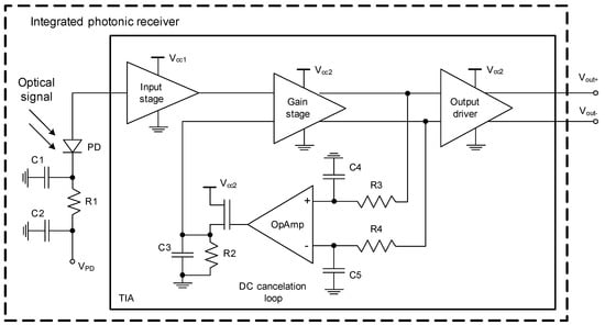 The receiver for the optical communication link contains PD, which detects the modulated signal and generates the electrical current, and TIA, which amplifies PD current and converts it to the differential voltage. The block diagram of the TIA with integrated PD is illustrated in Figure 8.