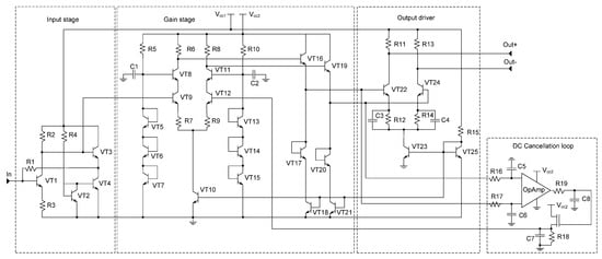 To exclude the influence of the parasitic DC current on the integrated photonic receiver performances, the DC cancellation loop is designed (Figure 8) []. The output voltages of the gain stage are taken using the low-pass filter (R3–R4, C4–C5) and are compared by the operational amplifier (OpAmp). The resulting low frequency error signal at the OpAmp output adjusts the voltage at the gain stage input. In addition, this DC loop performs a cancellation of the possible imbalance between two differential signal paths due to temperature, process variation, etc. The OpAmp is implemented on CMOS transistors using a differential amplifier circuit with an active load.