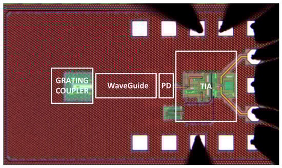 The layout of the manufactured photonic IC receiver is depicted in Figure 10; the chip size with optical and electrical pads is 1460 μm × 850 μm. The optical signal at the λ = 1550 nm wavelength passes in IC through the grating coupler and goes to the PD via a strip waveguide. Additionally, the PD is biased by reverse voltage VPD = 2 V to increase the sensitivity of the optical receiver. The bias circuits for PD are realized on the chip (Figure 8).