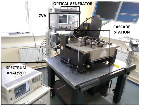 At first, the designed integrated photonic receiver was characterized on wafer using a probe station (Figure 11). The output signal was taken by GSGSG probe, while PD bias and supply voltage of TIA were fed using DC probes (Figure 9). The losses of the grating coupler are about 3 dB and depend on the incidence angle, wavelength and polarization. To get a maximum of optical coupling, special micropositioners at an incidence angle of 10–14° were used.