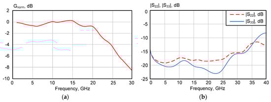 The measured normalized O/E conversion gain Gnorm and output reflection coefficients are illustrated in Figure 12. The measured value of f-3dB analog bandwidth is 22.5 GHz, which is enough for 25 Gb/s datalinks and agreed with simulated results []. The reflection coefficients at both output ports of photonic IC receiver (|S22| and |S33|) are better than −15 dB up to 30 GHz.