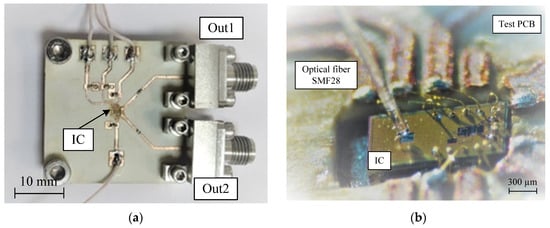 The second step is to measure the total conversion gain of the microwave photonic link that includes the E/O modulator and designed integrated receiver. For this purpose, the PCB with a photonic IC receiver using Rogers 4350B was designed. The chip was mounted and wire bonded on the PCB as depicted in Figure 13.