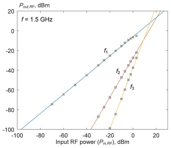 The conversion gain of the microwave photonic link as well as reflection coefficients of the E/O modulator and PCB receiver are shown in Figure 14b. The conversion gain varies from −13 dB up to −23 dB, and the receiver’s reflection coefficient is better than −10 dB up to 17.5 GHz. The reduction of the overall bandwidth is caused by limited E/O modulator bandwidth and wire bonding. As can be seen from the results, E/O modulator Lucent 2623NA is matched only up to 12–13 GHz. The gain slope of 10 dB from 1 GHz up to 20 GHz is determined by E/O modulator frequency response (6 dB slope up to 18 GHz) and losses in PCB transmission lines and connectors. Also, the linearity of the presented microwave photonic link with an external E/O modulator was measured. Figure 15 illustrates the measured output power at harmonics (f1, f2 and f3) at f = 1.5 GHz. The IIP3 value of 10 dBm at 1.5 GHz was obtained.