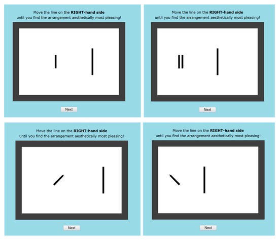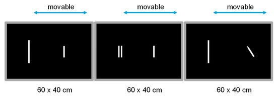 In her own study on symmetry and balance, Puffer [23] used arrangements of lines and other figures that were attached to a rectangular black surface (60 × 40 cm) with a gray frame (see Figure 1). There was a fixed element F on one side (left or right) of the surface, and a variable element V on the other side. F was placed successively at different distances from the center, respectively. In her various experiments, Puffer used elements of different size (short, long, or double lines), elements that suggested movement (oblique or curved lines), elements that arouse what she called “intrinsic interest”, i.e., attracted attention, and elements with perspective depth. In all cases, Puffer’s nine participants were asked to horizontally move the variable element V, which was always a vertical long or short line, until they found a position that made the arrangement most aesthetically pleasing. Finding such a position of V was the result of a long series of trials, so that each participant made only about ten choices per hour. They were never asked whether the resulting arrangement was balanced.
