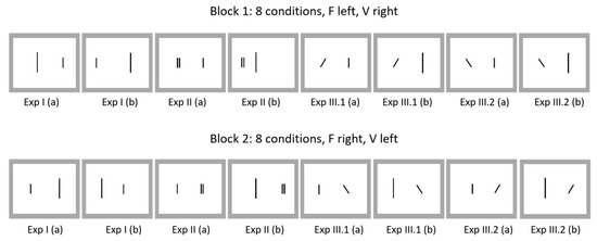 For each element type, F was successively presented at one of five locations (40, 80, 120, 160, and 200 pixels from the center) along the horizontal midline, respectively. As Puffer was not clear in this respect, we decided to present the center of F at these locations. Consequently, the inner edge distance could differ between different F, e.g., between single-line and double-lines. The five F locations combined with the eight F–V combinations resulted in 40 different conditions. Additionally, there was a left (F-left, V-right) and a right (F-right, V-left) version, as in Puffer’s study. The stimulus area (without gray frame) had an extension of 600 × 400 pixels and was horizontally centered on the screen with a light blue background (see Figure 3).