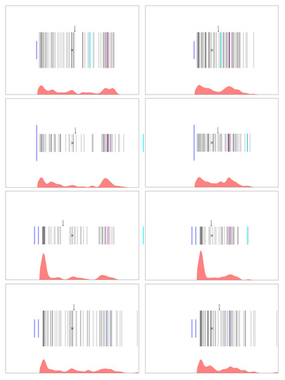 Although the validity of some of our hypotheses can already be assessed by visual inspection, we also wanted to do some statistical tests. For this objective, we considered the adjusted line positions for each condition as a spatial point (line) pattern [26]. Specifically, we assumed that the lines were placed in accordance with an inhomogeneous Poisson process. For such a process, the number of points that one can expect in a given region is expressed by its intensity function. For a homogeneous process the intensity is constant across all regions. This is certainly not the case for our data. To estimate the intensity for each region, we applied the R [27] function “density.ppp” from the library “spatstat” [26], where the standard deviation (sigma) of the smoothing kernel was set to 10. The results are shown as intensity plot at the bottom of each panel in Figure 4. The estimated intensity is more informative than the shown lines, because multiple lines might superimpose at some positions.