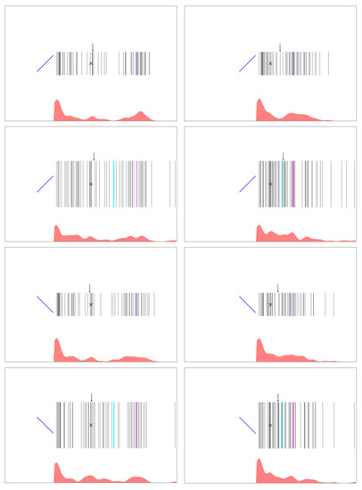 Example data are shown in Figure 4, where each row shows the data for two different locations of F for all eight conditions, respectively. As can be seen, the lines are not uniformly distributed. Rather, as expected, they cluster at some locations. To see to what extent the clusters coincide with our hypotheses, we computed the corresponding positions and marked them in the figure by thick colored lines. To calculate the positions for mechanical balance, we used the simple gray-value integration method (see above). Merely for the closeness hypothesis, we show no marks, because there was no single location.