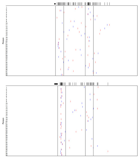 Individual performance of our 39 participants (Experiment 1) in the long-short (upper panel) and double-short (lower panel) conditions (F location: 80 pixels). The filled rectangles represent the fixed elements. The left and right border indicate the center and inner edge of the fixed element, respectively. The red and blue lines show the adjusted positions in the F-right and F-left block, respectively. The long vertical lines indicate the regions of interest for closeness and symmetry.