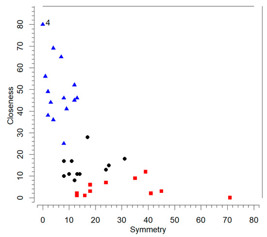 This figure shows preferences of the 39 participants (Experiment 1) with respect to symmetry and closeness. Each point represents one participant and indicates how many of her or his 80 adjustments are located in the region of interest for symmetry or closeness, respectively. The blue triangles represent participants who more often chose positions according to the closeness hypothesis than those in accord with symmetry. The red squares represent persons with the reversed preference. The black circles stand for participants that preferred neither of the two strategies. The single digit indicates that the adjacent point represents four participants.