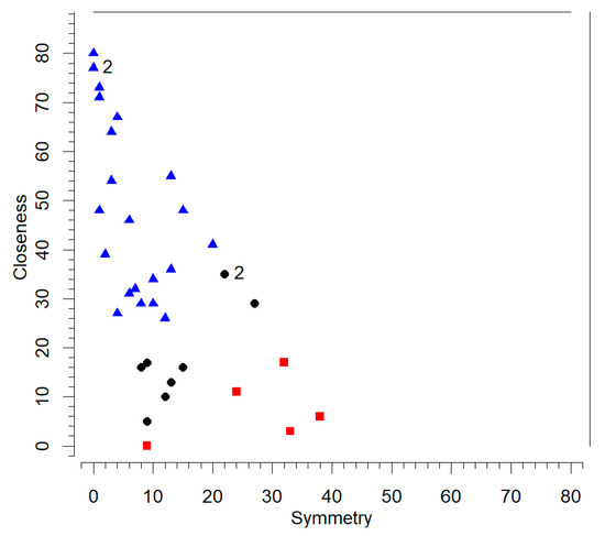 This figure shows the performance of the 36 participants in Experiment 2. Each point represents a participant and indicates how many of her or his 80 adjustments are located in the region of interest for symmetry or closeness, respectively. The blue triangles represent participants who more often adjusted positions according to the closeness hypothesis than to the symmetry hypothesis. The red squares represent participants for which the relation was reversed. The black circles represent participants that preferred neither of the two strategies. The digits indicate that the adjacent point represents two participants.