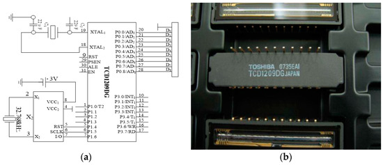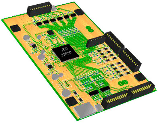 A charge-coupled device (CCD) [11] is a sensor that uses charge to realize signal transmission, enabling photoelectric conversion and signal charge storage and transfer. According to the working content of the linear array CCD module, chip TCD1209DG [12] with high sensitivity and high resolution is used as a chip of the linear array CCD module. The size of each photosensitive unit of tcd1209dg was 14 μm × 14 μm × 14 μm, the total length of the photosensitive array was 28.6 mm, the best working frequency was 1 MHz, and the maximum working frequency could reach 201 MHz. Because of its anti-interference advantages compared with the traditional chip, this paper chose this chip. The design of this hardware was to detect the micro-distortion signal effectively, so as to realize the detection of radar scanning signal. Using photodiode as the used pixel, the size of each pixel was set to 9.33 μm × 9.33 μm. The line CCD is shown in Figure 2.