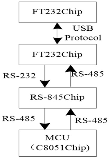 In order to realize the signal transmission unit, the connection between the USB interface with RS-232 and RS-485 interfaces was completed by using chip FT232. RS-232 interface was connected to the RS-485 interface through chip RS-485. Using C8051F (made by Silicon Labs, Austin, Texas, USA) as an MCU, the timing between the chips was controlled to avoid communication interruption caused by bus conflicts. The specific implementation process of the signal transmission unit is shown in Figure 4.