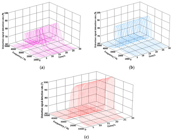 Comparison of detection rates for distortion signals. (a) Distortion detection rate of the method in [8], (b) Distortion detection rate of the method in [9], (c) Distortion detection rate of the proposed method.
