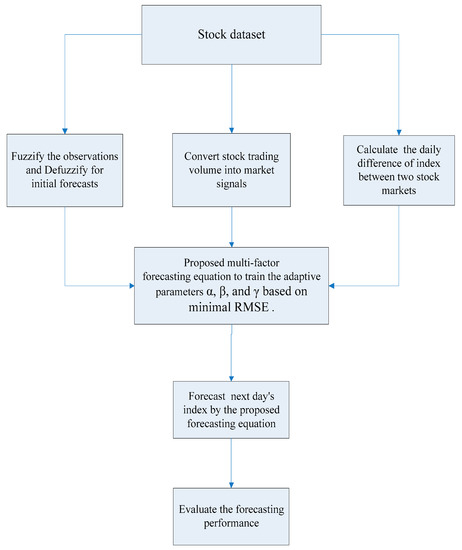 As mentioned above, this paper proposes a multi-factor fuzzy time series model to improve performance for stock forecasting. The proposed computational methods entails eight steps: (1) Collect datasets; (2) fuzzify the observations and defuzzify F(t) to obtain the initial forecast; (3) transfer trading volume into market signals; (4) calculate the daily difference of the indexes between two stock markets; (5) propose a multi-factor forecasting Equation; (6) adapt the best parameters for α, β and γ; (7) forecast the stock index; and (8) evaluate the forecasting performance. To detail the proposed model, each step of the proposed algorithm is described as follows: