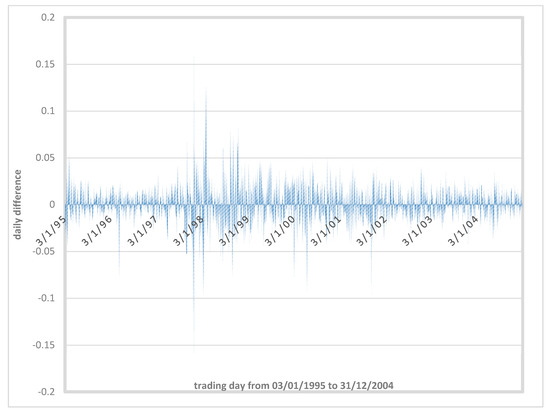 - β represents the degree of influence of the F(t + 1) forecast based on the difference between the forecast stock index and the actual stock index. Moreover, given the volatility limitation of TAIEX (±7%) and the lack of a limit for the HSI stock, we plot the daily fluctuation of HSI as shown in Figure 2. From Figure 2, we see that the daily fluctuation is no greater than ±15%. Then, we can set the range of β from −0.15 to 0.15 to search for the optimal β.
