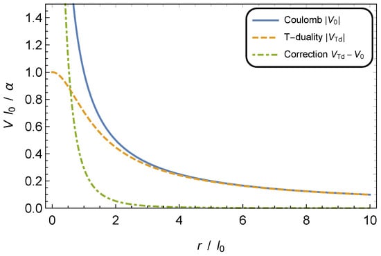 Potential energy. The solid curve (blue) displays the absolute value of the conventional Coulomb energy, , while the dashed line (orange) shows the absolute value of the T-duality corrected energy, . The difference of both equals the Hamiltonian contribution (dot-dashed curve, green).