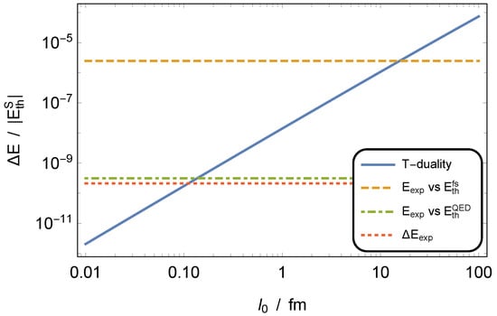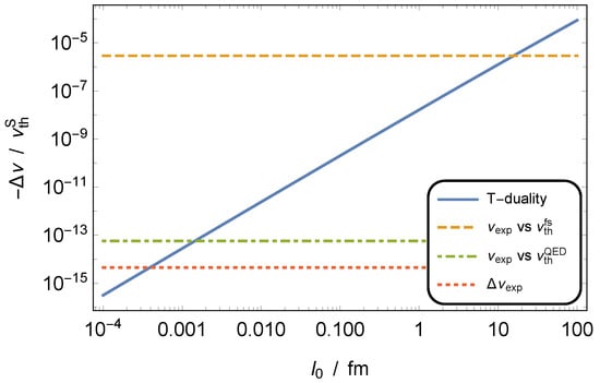 Figure 2 shows the relative T-duality contribution as a function of the zero-point length, . The reference values are included as well. The zero-point length has to be smaller than the intersection point value to comply with the corresponding bound. We found the upper bounds for to be 15.7 fm (from comparison of the fine-structure improved Schrödinger description with the experiment), 0.136 fm (from comparison of the state-of-the-art theoretical value with the experiment), and 0.112 fm (from the experimental precision), respectively.