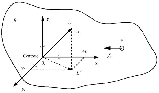 In order to improve the reliability of the analysis about the rigid modes, we need to locate the coordinate system on B (mass mB, moment of inertia ), and establish the origin of this coordinate system at the centre of mass of B. As shown in Figure 2, the coordinate is parallel to the coordinate system set up earlier. Then, a series of assumptions are made, including assuming L at any point on B. denotes six degrees of freedom of L, and represents the position of L point in B coordinate system. Also, denotes as any degree of freedom over J; is expressed as a force exerted on the degree of p-freedom; and denotes the position of point P in the coordinate system.