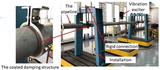 To further explore the nonlinear dynamic model proposed in this paper, according to the installation method of engineering application, the experimental bench of the coated pipeline system as shown in Figure 3 was established. The experimental system mainly contained the following five parts: The excitation system, data acquisition system and measurement system; the pipeline with two-point and symmetrically supported brackets; the coated damping structure; the installation base; and the rigid connection. The excitation system consists of JZK-50 vibration exciter (maximum excitation force 500 N, amplitude ±10 mm) and E5874A power amplifier. The data acquisition system consists of VT-900X vibration controller with data acquisition and analysis software. The measurement system consists of YD-303 piezoelectric quartz force sensor and KD9004 eddy current displacement senor. The coated damping structure was composed of elastic-porous metal rubber, coated rings, and the specific coated form. The related experiment equipment and effective test method can be found in the previous works []. It should be pointed out that the coated damping structure with elastic-porous metal rubber has a sound effect on vibration reduction of the pipeline system []. In this work, the application of elastic-porous metal rubber for the damping element enwrapped on the outer wall of the pipeline was due to its excellent vibration absorption performance [,].