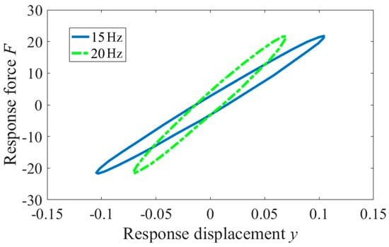 During the experimental test, the sinusoidal excitation force with various frequencies was applied to the coated pipeline system and its displacement response was measured. For the unification of excitation magnitude, an excitation condition of 40 mvpp for the pipeline system with the voltage loading amplitude was adopted. The curve of response force F and response displacement y can be plotted as Figure 4 when the excitation frequencies of 15 Hz and 20 Hz were used respectively.