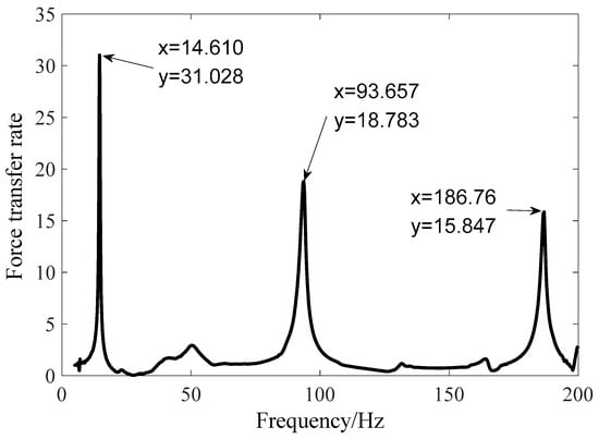 The dynamic test with a broadband sweep frequency range (5–200 Hz) for the coated pipeline system was performed to improve the reliability of the experiment. Two layers of elastic-porous metal rubber were used, and the magnitude of excitation applied is set as 20 N. The experimentally measured force transfer rate-frequency curve can be plotted as Figure 5. It can be seen that the system exists three modes in the frequency range of 5–200 Hz. They are 14.610 Hz, 93.657 Hz, 186.76 Hz, respectively. The corresponding response force F and the response displacement y are not consistent under the conditions of 15 Hz and 20 Hz as mentioned in the Section 4.2. Due to the condition of 15 Hz as the resonance frequency band, the response force of the whole system is far greater than the basic force. This is reasonable for the dynamic analysis. Due to the increase of the response displacement caused by the resonance, the displacement under 15 Hz is larger than other frequencies. However, when the excitation frequency is up to 20 Hz, the non-resonant station of the coated pipeline system occurs, resulting in the degradation of the response force and the corresponding response displacement.