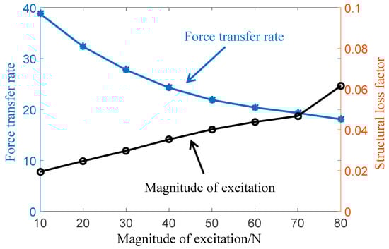Figure 6 shows that the peak of the force transfer rate TAm decreases gradually and the structural loss factor η linearly increases with the increase of the magnitude of the excitation. This is due to that the vibration damping amplitude of the elastic-porous metal rubber increases with the increase of excitation magnitude. The slip amplitude between the inner metal wires increases, leading to the increase of energy dissipation. The energy dissipation of elastic-porous metal rubber is generated by the sliding dry friction between the inner hooked wires. When the excitation magnitude increases from 10 N to 80 N, the force transfer rate obviously decreases and the loss factor shows an obvious increase trend. The excitation magnitude plays a considerable role on the energy dissipation of elastic-porous metal rubber and its vibration damping system.