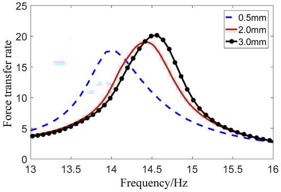 Integrated with the excitation magnitude of 80 N, different pre-tightening conditions (0.5 mm, 2 mm, 3 mm) were applied to the coated pipeline system. Figure 7 shows the corresponding force transfer rate curves. The peak of the force transfer rate TAm can be obtained and then the structural loss factor η is calculated based on the half-power method, as listed in Table 2.