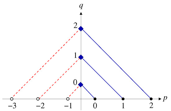 When q is non-negative integer, the adjoint equation has a polynomial solution, up to a multiplicative constant, where is the qth-order Hermite polynomial function. By the symmetry presented in the main text, the polynomial solution of with is . For non-integer or negative values of , the symmetric solution satisfying , and is and the antisymmetric solution satisfying , and is , where is the confluent hypergeometric function of the first kind [14,15].