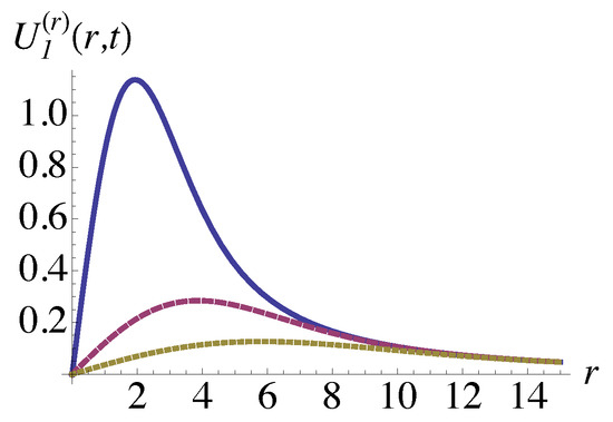 where D is the (cooperative) diffusion constant , with f, , and K being, respectively, the permeative friction coefficient between the gel network and solvent, the shear modulus, and the bulk (osmotic) modulus of the gel [8]. Hereafter, we use the units such that . In the late-stage, , at large distance , Equation (7) allows the similarity solutions of the form, , where is compatible with our initial condition. See Appendix B for the details including the analytical solutions. Figure 2 shows the evolution of self-similarity solution, , at and . We see there that the algebraic tail of the radial displacement at large r remains unchanged until the time .