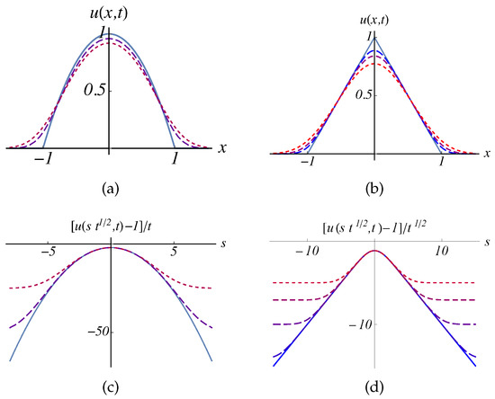 (a,b) Initial conditions (solid curves) as well as the short-time evolution at and (dashed curves in (a)) and at and (dashed curves in (b)), respectively, are shown versus the unscaled variables. The initial condition has and the support, (c,d) The scaling function and the short-time evolution are represented using the scaled variables: (c) replots the evolution in (a) using and and compares with while (d) replots the evolution in (b) using with s and compares with .