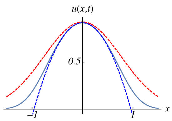 Parabolic or wedge-shaped apexes are among the most generic local configurations that we encounter as the initial conditions of diffusion. While the former is generic form around the smooth extrema, the latter should be realized when some spatially localized source is removed after having established the wedge-shaped steady state profile. We discuss the simple case of one-dimension, but the generalization to higher dimensions is straightforward. In Figure 3a,b, the parabolic and wedge-like initial conditions are shown by solid curves, respectively. Their functional forms are and .