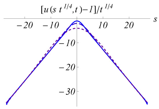 Most generally the solution or its derivative do not decay rapidly for a given value of . Equation (9) under a given allows two independent even solutions of which one solution can have the power-low asymptote . In [11], the special case corresponding to with rapidly decaying derivative has been analyzed. As in the case of diffusion, the scaling function with power-law asymptote implies the static algebraic asymptote in space, (), because the algebraic asymptote of issues from the balance of the last two terms on the left-hand side of Equation (9), which in turn implies . Figure 5 shows, in the scaled coordinates, the evolution from the wedge-like initial configuration, which corresponds to .