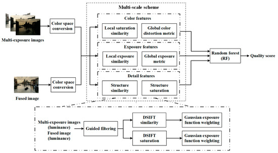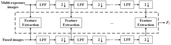In addition, multi-scale characteristics in spatial domain can acquire the image content from the fine level to the coarse level, which is consistent with the processing mechanism of low-level retina and cortex in primate visual system. As illustrated in Figure 7, the original scale of multi-exposure images and fused images are marked as scale 1. By iteratively applying a low-pass filter and a down-sampling operation with a factor of 2 on the original images, the filtered images at scale l can be obtained after l-1 iterations. Then, the above-mentioned feature extraction method is conducted in the multi-scale space, thus generating the final feature vector Ff = [F1, F2, F3], where F1, F2, and F3 are color, structure and exposure features, respectively. After feature extraction, the quality regression from feature space to image quality is conducted, which can be denoted as