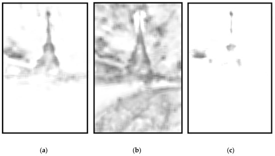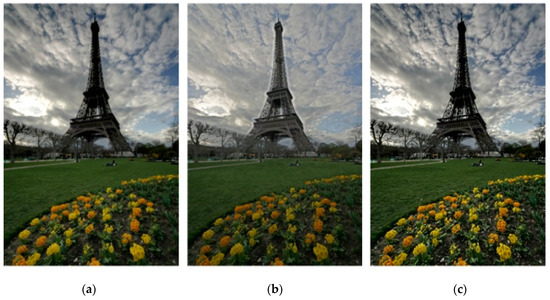 Figure 4a–c depicts the corresponding DSIFT similarity maps of Figure 3a–c, respectively. From Figure 4, it can be found that the edge distortion areas in Figure 3a,b (e.g., the center of tower, the brightest cloud and the sky) are well reflected in the calculated quality maps. However, Figure 4c shows the false results at the position of enhanced pixels in Figure 3c, because detail enhancement usually makes the edge information of images change strongly. Actually, an appropriate detail enhancement algorithm will produce more attractive results subjectively, which is just opposite of the impact caused by DSIFT similarity. Therefore, it is necessary to add the DSIFT saturation on the basic of DSIFT similarity to eliminate this effect.