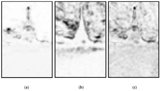 Figure 5a–c shows the corresponding DSIFT saturation maps of Figure 3a–c, respectively. From Figure 5, it can be seen that Figure 5c has higher saturation at the position of pixels with enhanced detail information in Figure 3c, which eliminates the undesired effects caused by DSIFT similarity. Fortunately, the detail loss areas in Figure 3c are also reflected on Figure 5c, demonstrating the validity of the proposed DSIFT saturation metric.