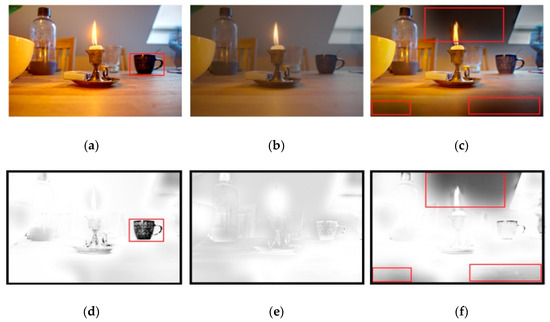 Figure 6a–c depicts three fused images of sequence “Candle” created by different algorithms, and Figure 6d–f are the local exposure similarity maps of Figure 6a–c, respectively. Obviously, there are several under-exposed areas (e.g., the teacup in Figure 6a and the shadows in Figure 6c) that are inconsistent with surrounding areas in terms of luminance. Such exposure distortion is clearly indicated in the corresponding quality maps. Moreover, Figure 6b has the uniform luminance distribution, but it is darker on the whole space than Figure 6a,c, which still results in the bad visual perception. Therefore, it is essential to consider the impact by the overall luminance.