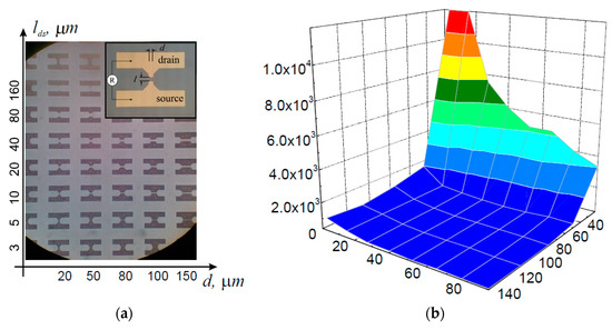 Static current–voltage curves of test elements show that, while d > 30 µm and lds > 60 µm, sheet resistance (resistance per square) ρ▯ = (d × Rds)/lds ≈ Const (Figure 1b) within the scope of the admissible values, and channel resistance Rds and drain saturation current Ids have virtually linear dependence on d and lds. If d and lds are equal to or less than given values (d ≤ 30 µm, lds ≤ 60 µm), the value ρ▯ = ρ▯(d, lds) becomes a function of d and lds (Figure 1b), and there is nonlinear dependence of values Rds = Rds(d, lds) and Ids = Ids(d, lds). As the result, it is possible to conclude that the given HES sheet resistance ρ▯ = ρ▯(d, lds) depends largely on channel length lds and width d in the range of practically valuable measurement scales (linear sizes)—that is size effect.
