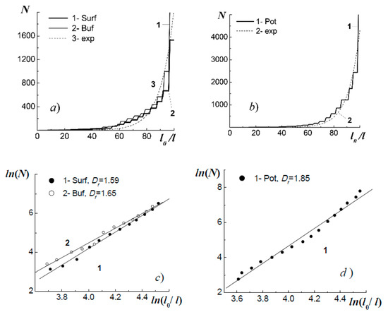 Filling contours obtained after tracing the lateral irregularities of the surface potential form non-overlapping embedded sets (Figure 3b(II)), and these linear sizes in the (x,y) plane, just like the lateral sizes of the relief irregularities, depend upon the measurement scale l. In this case, the existence of the attributes of statistic self-similarity, and subsequently fractality, is proven by the linear dependence of ln(N(l)) upon ln(l0/l) (Figure 2d). As Figure 2b shows, the “freaking stairs” can be well approximated with the exponent.
