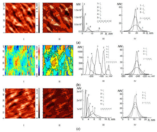 An initial check of surface potential irregularities Δφ(x,y) (11) with the use of AFM techniques (Figure 3b(I)) shows the maximum spread of the values up to 90 mV.