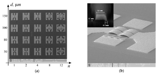 As the result, at the same chip a matrix of AlGaN/GaN HEMTs with lg = 150 nm was formed. HEMTs differ from each other, not only by section number n = 1, 2, 4, 8 and 12, but also by channel width dds = 50, 80, 100 and 150 µm (Figure 4a).