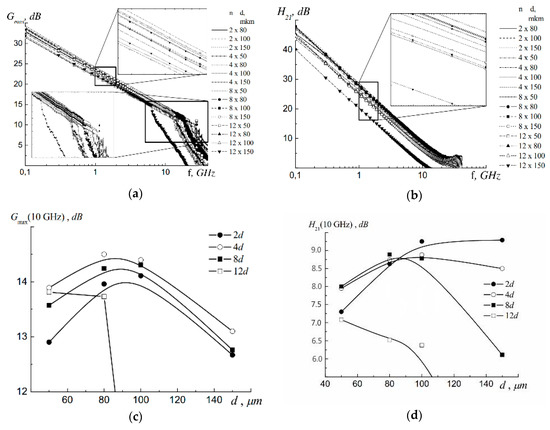 The frequency dependences of maximum values of the power and current amplification factors Gmax(f)—(a) and H21(f)—(b), correspondingly. The functional dependences Gmax = Gmax(d)—(c) and H21 = H21(d)—(d), measured at different values of n at frequency f = 10 GHz.