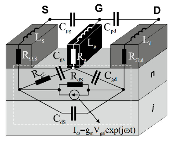 As it is seen in Figure 6, there are internal (encircled with the dotted line: Rgs is gate-source resistance; Rds is drain-source resistance of the depletion region; Cgs is gate-source capacity; Cgd is gate-drain capacity; Cds is drain-source capacity; Ids is drain current source controlled by the gate-source voltage; gmax is transconductance; τ is a time constant of the frequency dependence of the current source) and external parts of the field-effect transistor small signal model EC.