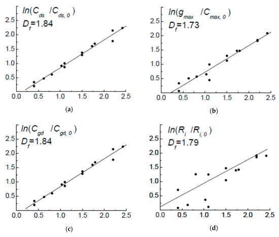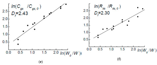 For this purpose, let us use the measures Mk,i of the parameters Pk,i in the expression (8), which correspond to different total widths of the transistor channel W = n × d. For example, if the initial value M0 in every such subspace SM(Mk,i) of the transistor parameter values Pk,i is equal to the parameter value Pk,0 corresponding to the maximum channel total width W0 = 1800 µm, then η = Pk,i(Wi)/Pk,0(W0), and ζ = Wi/W0. The dependences ln(Pk,i/Pk,0) on ln(W0/Wi) written in log–log scale are well approximated by the straight lines (Figure 7), which in accordance with that stated above (see Section 3) point out the presence of self-similarity properties of subspaces SM. This make it possible to operate with the studied subspaces of the measures of the parameter Pk,i as with the fractal or multifractal objects, and use the expression (8) to define their DH (Table 2). The values DH(f) of the resistances Ri and Rds are calculated by their inverse values—conductivities Gi = 1/Ri and Gds = 1/Rds. Such substitution does not change the absolute values |Df|, but keeps its positive sign and dimensional subsequence.