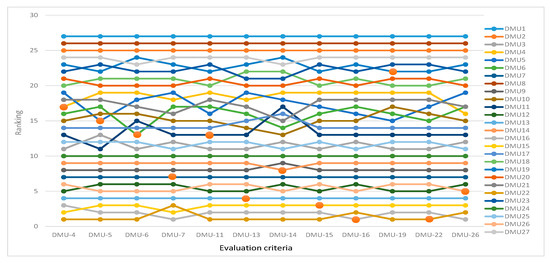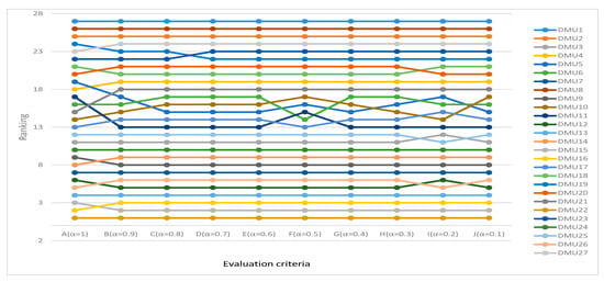 The application example involves 27 innovative machinery manufacturing enterprises in Fujian Province, located in different cities in Fujian Province. The CCR-efficiency of each enterprise is shown in last column of Table 15. According to CCR-efficiency, 12 out of the 27 sampled enterprises are DEA effective. The interval weights of these 12 DEA-effective enterprises are obtained by solving model (5), as shown in Table A1 of the Appendix A. On the basis of the interval weights (Table A1 of the Appendix A), 10 ECEDs are denoted by A, B, C, D, E, F, G, H, I, and J, when the values of α were 1, 0.9, 0.8, 0.7, 0.6, 0.5, 0.3, 0.2, and 0.1, respectively. With any decrease of α, the value of ECED increases gradually. That is, the ECED is the minimum of the 10 evaluation criteria when α = 1 and the highest evaluation criteria when α = 0.1. The 10 ECED are shown in Table A2 of the Appendix A. For the 27 enterprises, if they are evaluated in a non-differentiated way (such as using the common weight evaluation method), then it is not conducive to encouraging enterprises in different regions to carry out innovative activities according to local conditions. However, evaluating these enterprises in a differentiated way (such as using the traditional cross-efficiency evaluation method) allows each enterprise to avoid its own weaknesses and emphasize its own advantages. In this case, the evaluation results will inevitably be unfair. Therefore, differentiated evaluation under evaluation criteria is carried out for these 27 enterprises, that is, cross-efficiency evaluation under the 10 criteria (Table A2 of the Appendix A). The comparison of the evaluation results is shown in Figure 1 and Figure 2.