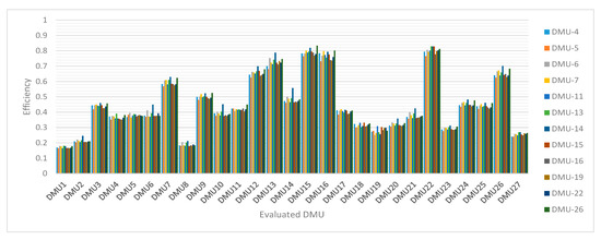 | DMU13 | (0, 0.5) | (0, 0.04005) | (0, 0.0094) | (0, 0.30675) | (0, 0.0004) | (0, 0.00295) | (0, 0.01035) | (0, 0.5804) |