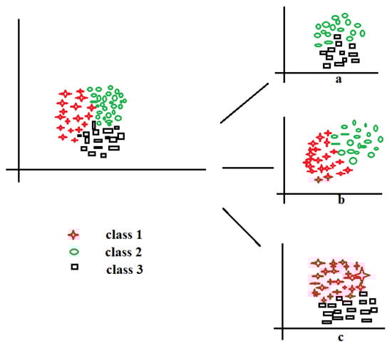 Quantitatively, the reason for the imbalanced class is known as imbalanced ratio (IR) [,,]. The imbalance ratio is the ratio of the majority class to the minority class for imbalanced binary data in the population or ratios of all the classes for imbalanced multi-classed data in the population. Figure 2 presents imbalanced binary and multi-class data.