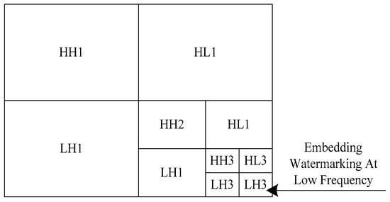 The wavelet transform has been intensively applied in image processing in recent years. The basic idea of image processing is to decompose the image into sub-images of different spatial and independent frequency bands, and then process the coefficients of sub-images, such as image compression, image enhancement, image decomposition, and reconstruction. According to the pyramid decomposition algorithm proposed by S. Mallat, four 1/4-size subgraphs are formed after first-order decomposition (low-frequency approximation subgraph LL1 with most of the image information; medium and high-frequency detail subgraphs HL1, LH1, and HHH1 with edge and texture information in the horizontal, vertical, and diagonal directions, respectively; and then the approximation subgraph LL1 with the complete phase) [8]. In the same way, the smaller subgraphs LL2, HL2, LH2, and HH2 at the next resolution are low-frequency approximation subgraphs, and HL2, LH2, and HH2 represent high-frequency detail subgraphs; LL2 is decomposed once more. After decomposition, 10 subgraphs are obtained (as shown in Figure 1), including HL1, LH1, and HH1 (Level 1); HL2, LH2, and HH2 (Level 2); and LL3, HL3, LH3, and HHH3 (Level 3). With the increase of decomposition series, the resolution decreases and the energy of wavelet coefficients increases. In other words, the resolution of the first level is the highest and the frequency is the highest, the resolution of the third level is the lowest and the frequency is the lowest, the energy of the wavelet coefficients of the first level is smaller than that of the second level, and the energy of the wavelet coefficients of the second level is smaller than that of the third level. The low frequency band represents the best approximation of the original image at the maximum scale and the minimum resolution determined by the decomposition series of the wavelet transform. Its statistical characteristics are similar to those of the original image [9], where most of the energy of the image is concentrated. The high frequency band part represents the edge and principle of the image. On the premise of ensuring better transparency (invisibility) of the watermarking, the location of the hidden watermarking information is selected in the third-level wavelet coefficients with the largest energy, which can achieve better robustness.