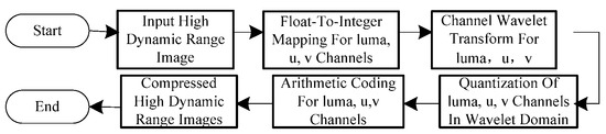 The compression algorithm is divided into five steps, including color space conversion, floating-point to integer conversion, discrete wavelet transform, quantization, and entropy coding.
