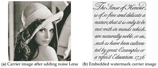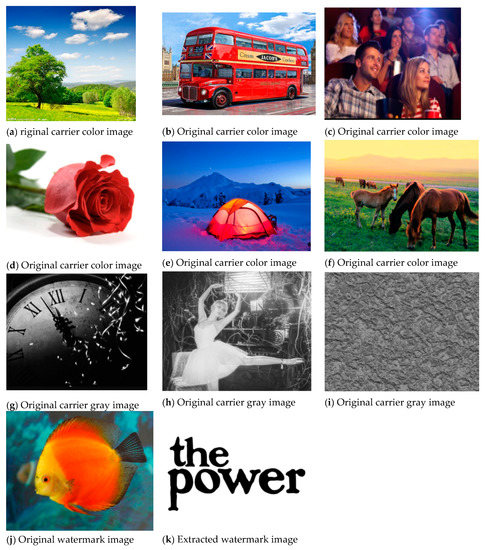 In order to verify that the digital watermark image encrypted by this method has a strong anti-cutting and anti-noise performance, the image is simulated in this paper. In the experiment, the gray image and color image with the size of 243 × 243 pixels are used as the original carrier image. As shown in Figure 7a–i represent color and gray image in 64 × 64 binary image marked with “abcdefghigk”, which has rich color, texture, detail, area, theme, and plane background. Figure 7g,j show the original watermark image and extracted watermark image. Figure 7b,f,j test the anti-brightness performance and contrast attack performance of the image.