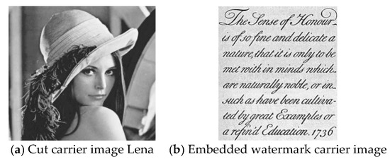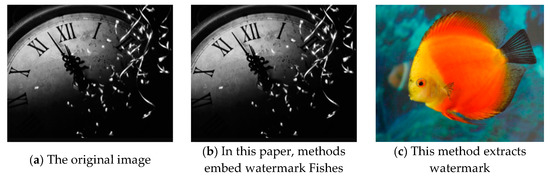 - The data in the watermarking and the data in the original image subgraph are coded in blocks according to the following formula:where is the DWT coefficient before embedding, is the wavelet strength parameter, is the embedding watermarking, and represents the embedding watermarking. Subgraphs with different intensities and in different directions allow the embedded watermarking to have a certain degree of self-adaptability.